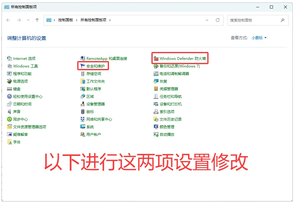 找到“Windows Defender防火墙”选项进入(如果没看到防火墙选项,右上角 查看方式 → 切换为小图标 就有了)