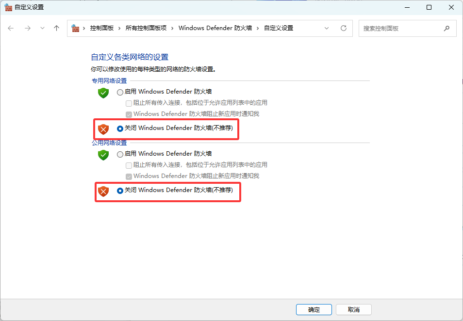 都改成“关闭Windows Defender防火墙”,最后点击“确定”