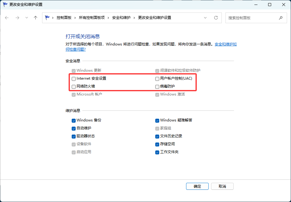 先点击 更改安全和维护设置 → 把 安全设置、用户账户控制、网络防火墙、病毒防护 全部取消勾选点击确定