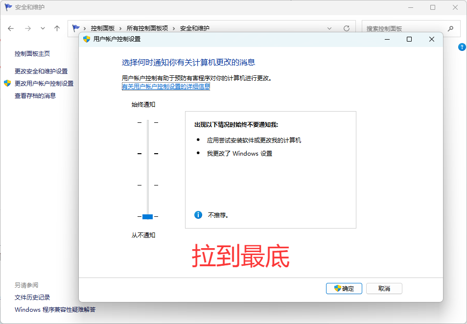 然后返回上一步 再点击 更改用户账户控制设置 → 拉到最低 点确定保持【至此控制面板所有设置完成】