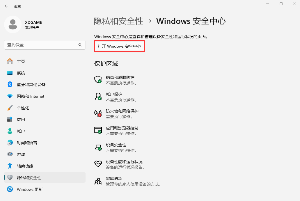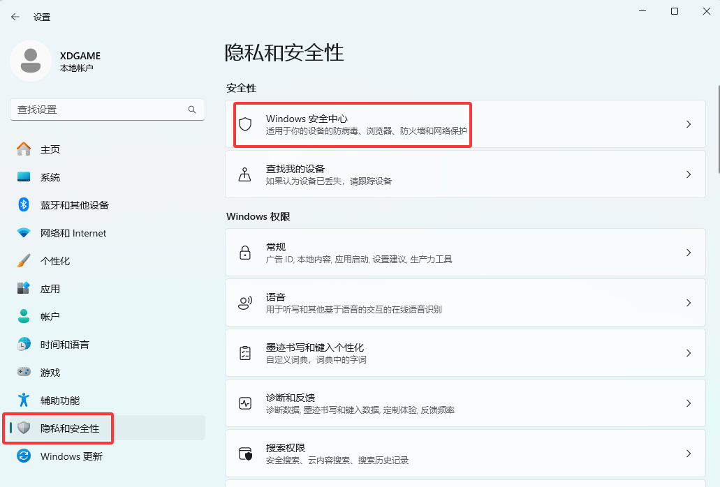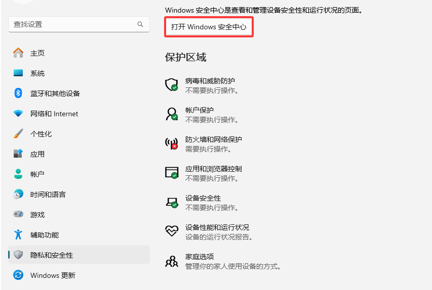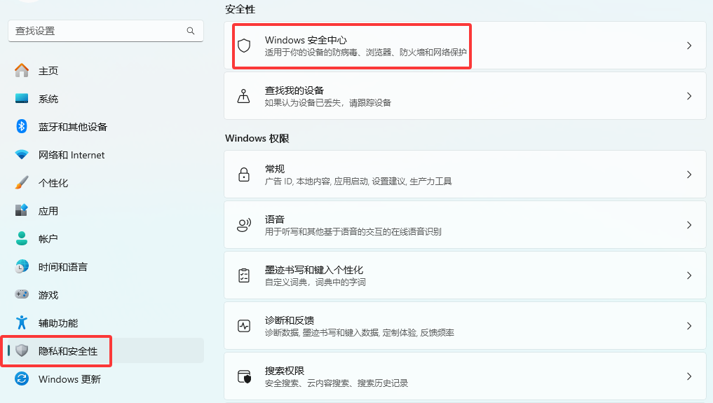 打开Windows设置 → 点击左侧的“隐私和安全性”→ 点击Windows安全中心 进入