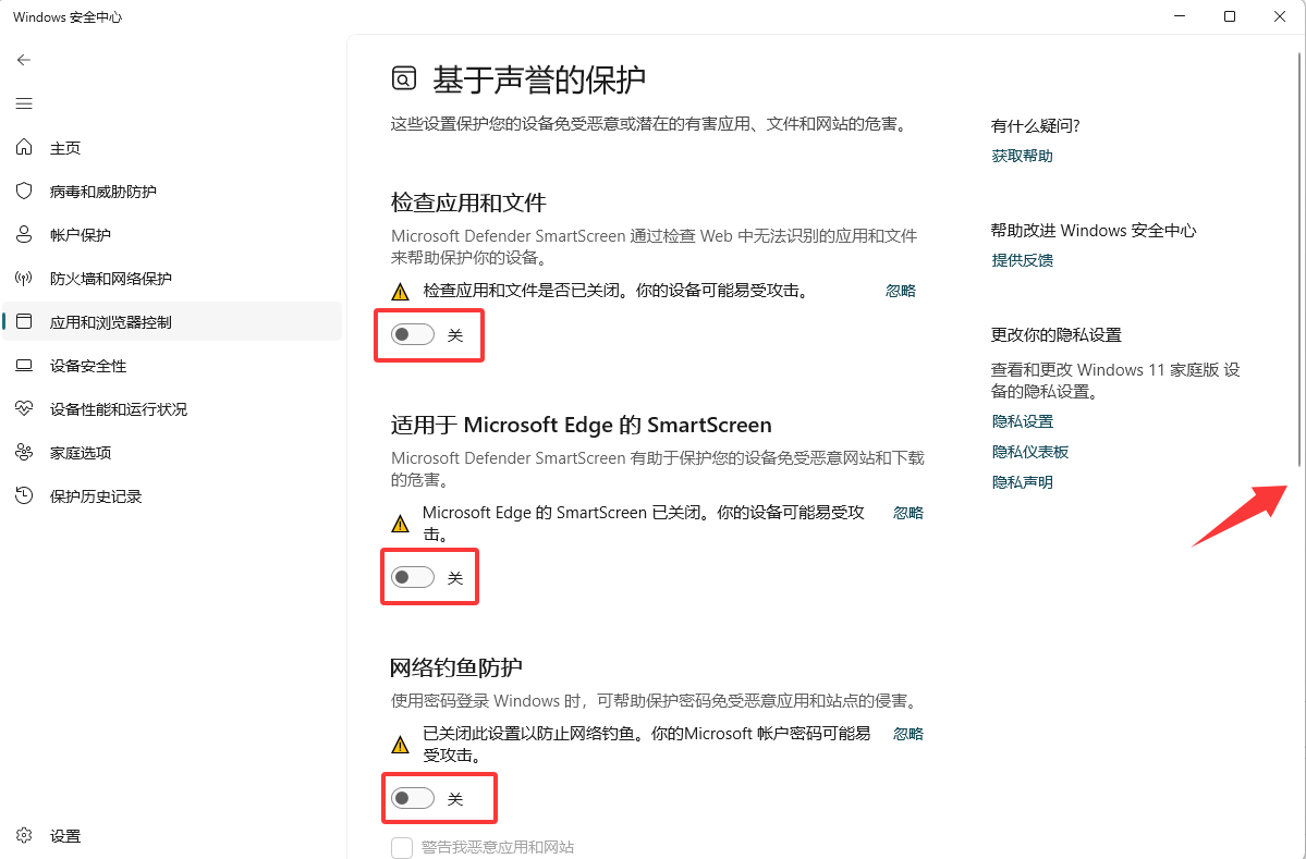 然后继续点击左侧 → 应用和浏览器控制 → 基于声誉的保护设置 → 所有通通关掉 下拉到底全部关掉