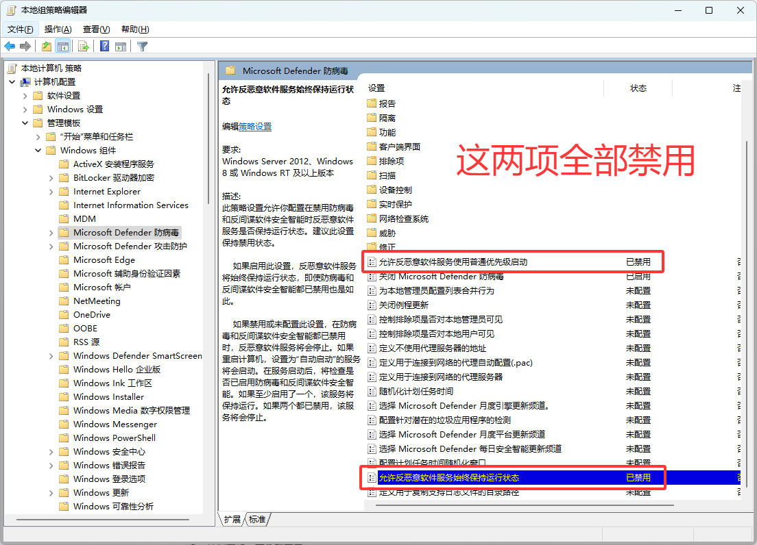 点击“管理模板/Windows组件/Microsoft Defender 防病毒”进行以下两项操作