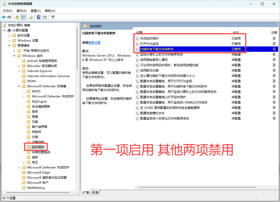 接着点击“管理模板/Windows组件/Microsoft Defender 防病毒/实时保护”进行以下三项操作