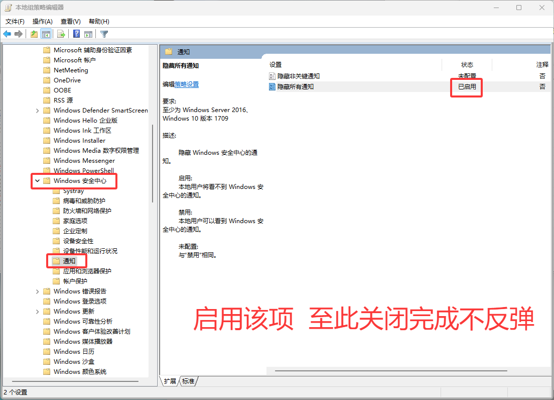 双击“隐藏所有通知”选择启用