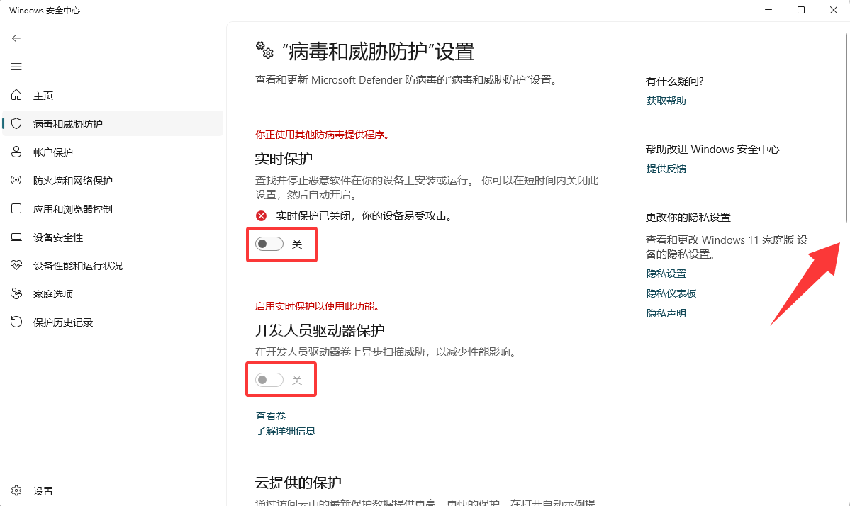 点击左侧 病毒和威胁防护 → 下拉找到 病毒和威胁防护设置 → 管理设置 → 所有通通关掉 下拉到底全部关掉