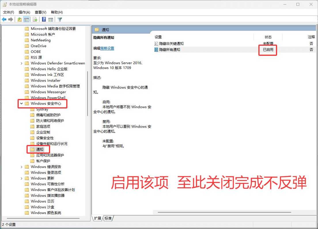 接着点击“管理模板/Windows组件/Windows安全中心/通知”进行以下一项操作