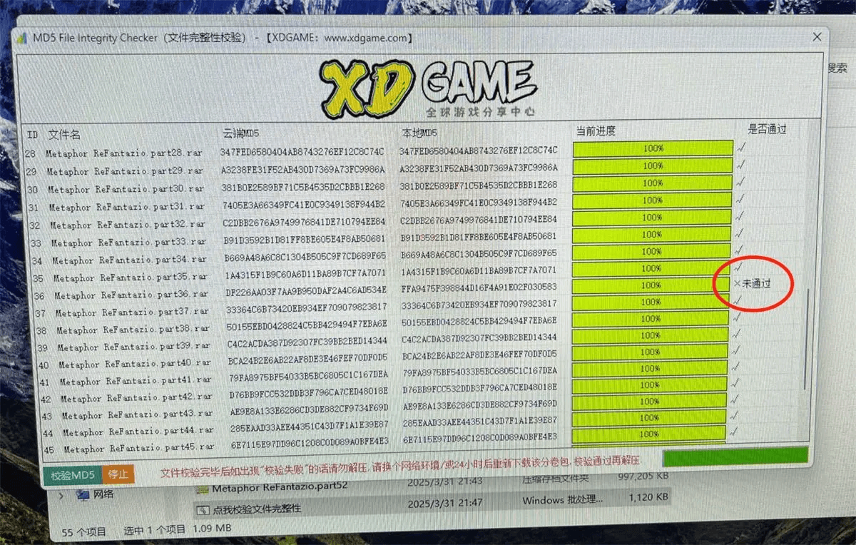 由上图可见,我们坏的包名是Part36分卷包,我们在本地先删除36这个文件,在去网盘重下一遍这个文件,放回目录里验证一下试试。